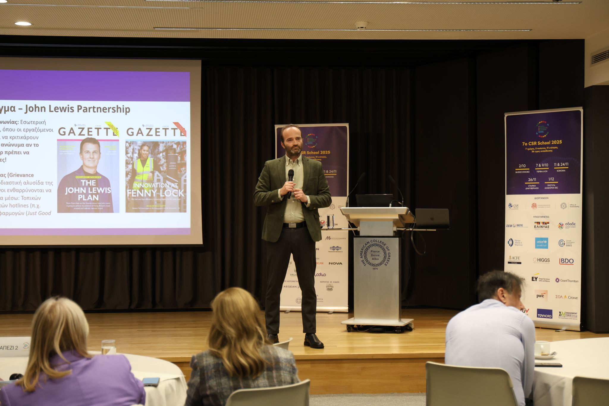 Giannis Vikas, Assistant Professor, Deree – The American College of Greece, presented the latest trends in sustainable finance and impact investing, offering participants a clear view of how ESG factors are shaping financial decision-making.