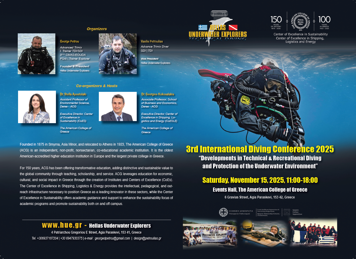 On Saturday, November 15, 2025, The American College of Greece hosted the 3rd International Diving Conference 2025 on Developments in Technical & Recreational Diving and Protection of the Underwater Environment. The Conference was co-organized by the Hellenic Underwater Explorers (HUE) and the ACG Center of Excellence in Sustainability (CoES) and the ACG Center of Excellence in Shipping, Logistics and Energy (CoESLE).