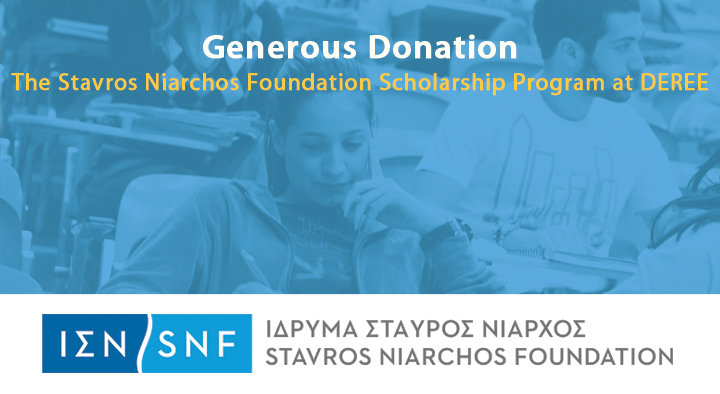 John Zervakis, Chief Operating Officer of the SNF office in Athens, stated “The grant to DEREE is part of the Foundation’s ‘Recharging the Youth’ initiative, which aims to help create new opportunities for Greece’s younger generations. The scholarship program will provide academically qualified students, lacking the financial means, the opportunity to further their studies at a first rate institution.”